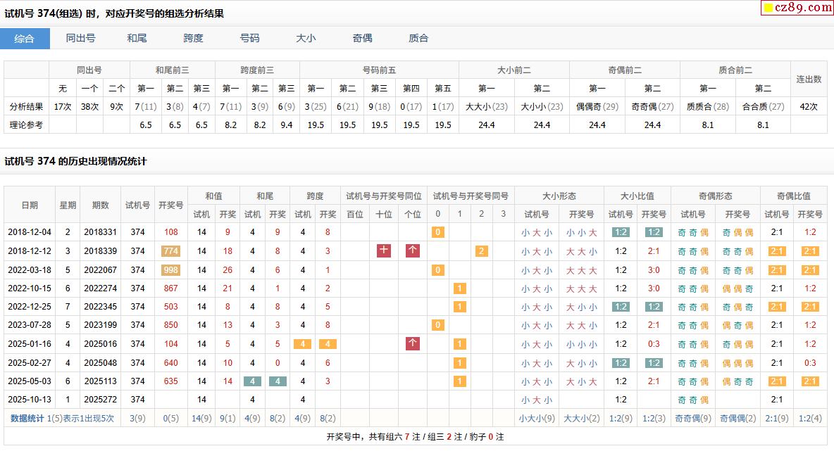 > 272期福彩3D试机号374对应开奖号的组选分析结果
